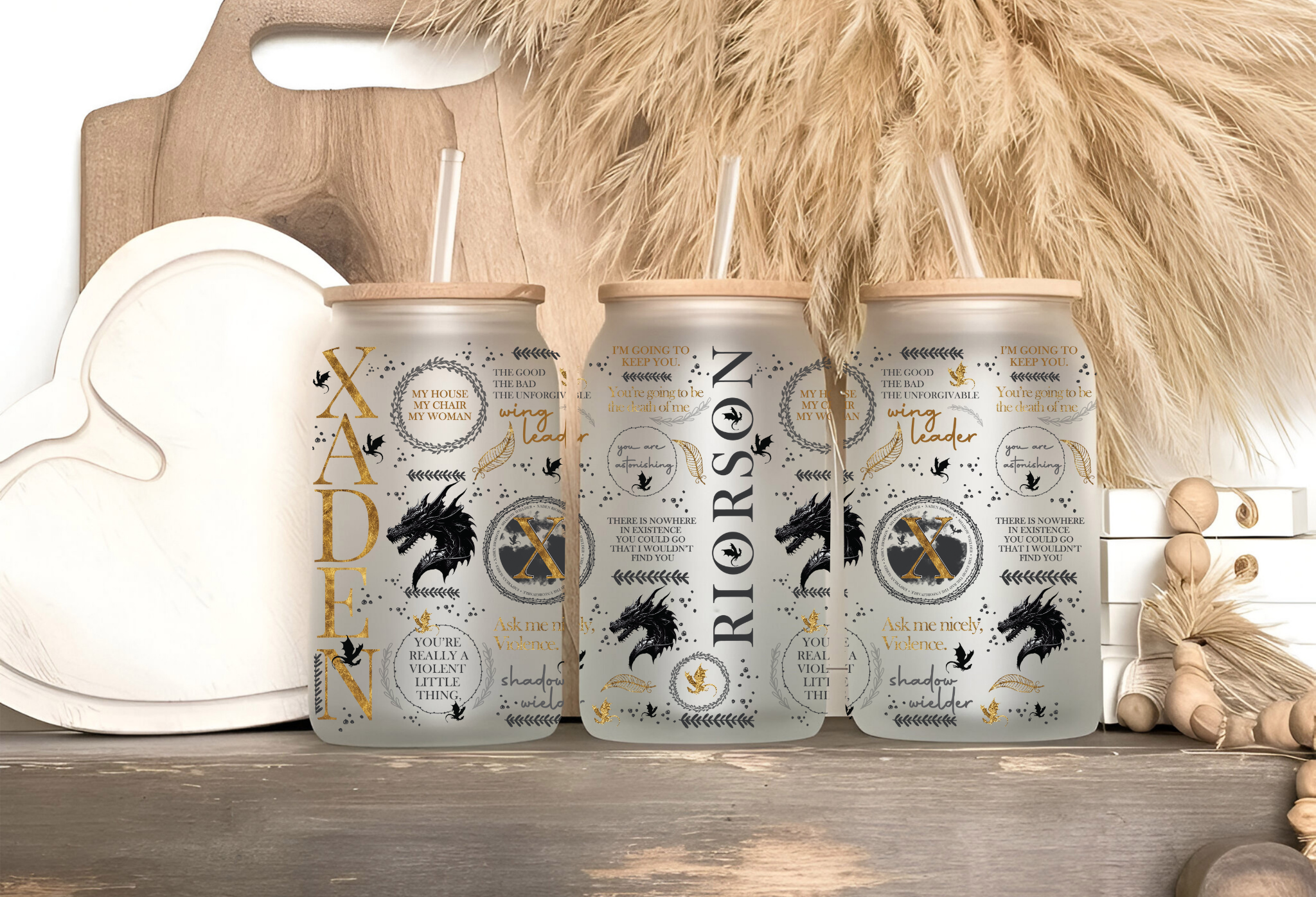 Dit ijskoffieglas brengt jouw liefde voor Fourth Wing en Xaden samen met dagelijks gebruiksgemak. Het is een stijlvol, functioneel en duurzaam accessoire dat perfect is voor boekfans die hun fandom subtiel willen tonen of op zoek zijn naar een bijzonder cadeau.