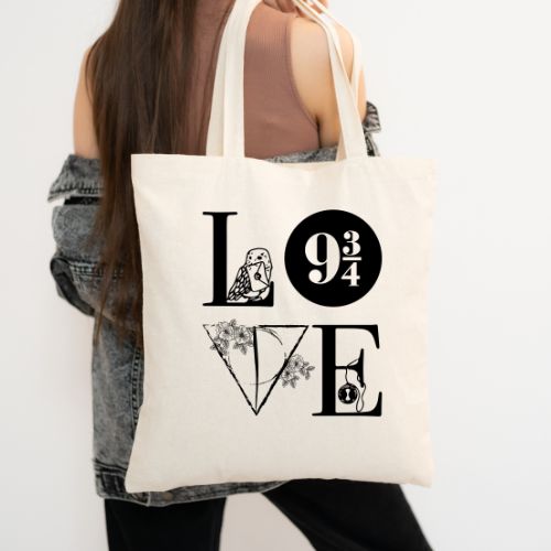 Katoenen tas met bedrukking: Love. De perfecte tas voor iedereen die van lezen houdt en met name Harry Potter! Deze tas is het perfecte cadeau voor een vriend(in) die graag leest of natuurlijk voor jezelf! Wellicht is het een perfecte tas voor iemand die les geeft in literatuur of in de bibliotheek werkt. De perfecte tas voor een dagje shoppen, universiteit of school!