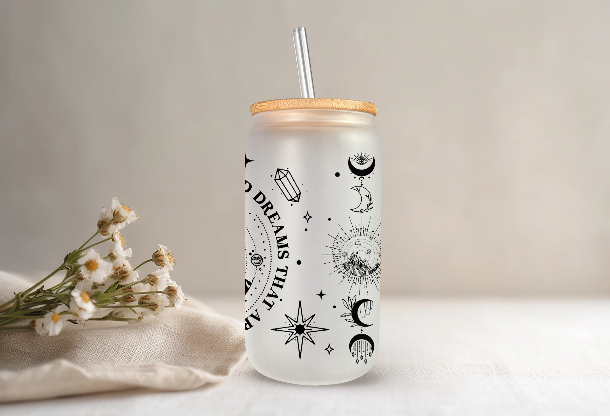 Het prachtige ontwerp dat is geïnspireerd op de zin “To the stars that listen and the dreams that are answered” uit het boek “A Court of Mist and Fury” van Sarah J. Maas maakt het glas uniek. Het glas is versierd met delicate sterren en een subtiel maanpatroon. Dat zorgt voor een betoverende sfeer terwijl je van je ijskoffie geniet. Het ontwerp is gedrukt met een speciale techniek die zorgt voor een langdurig en kwalitatief resultaat. Zelfs na veelvuldig gebruik.