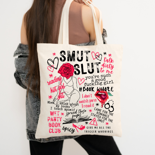 Ontdek de ‘Tote Smut Slut’ katoenen tas met unieke quotes, met liefde handbedrukt. De ultieme tas voor romantici en levensgenieters! Het perfecte cadeau voor boekenwurmen en een geweldige traktatie voor jezelf. Ideaal voor literatuurliefhebbers, bibliotheekliefhebbers en docenten. Een must-have accessoire voor shoppen, universiteit of school!